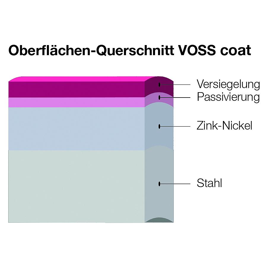 Salzsprühnebeltests nach DIN EN ISO 9227 zeigen: VOSS coat bietet einen besseren Korrosionsschutz als herkömmliche Zink-Beschichtungen. Bauteile mit VOSS Oberflächenbeschichtung bestehen unter Praxisbedingungen im montierten Zustand bis zu 1.000 Stunden bis erster Rost entsteht. Gleichzeitig behalten VOSS coat beschichtete Bauteile die Vorteile von Stahl: Höhere Festigkeit bei gleichem Gewicht und ein deutlich niedrigerer Preis. Die Verwendung von Stahlbauteilen mit VOSS coat ermöglicht Kosteneinsparungen von bis zu 90%.